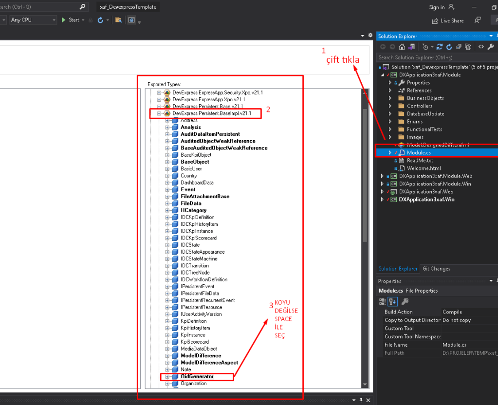 Eğer BusinnesObjects Class XPObject üzerinden inherit oluyorsa (varsayılan BaseObject) Detail viewde oid alanı gelmekte. Bunu gizlemek için Module\Module.cs eklenmeli;