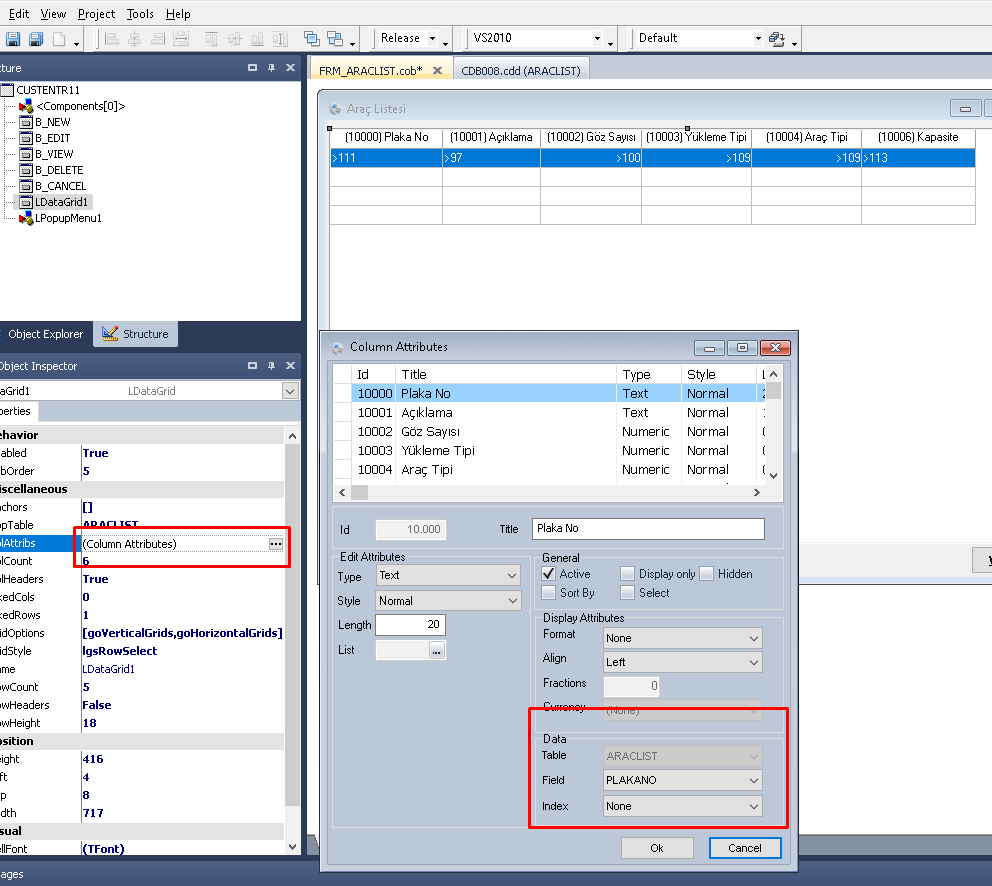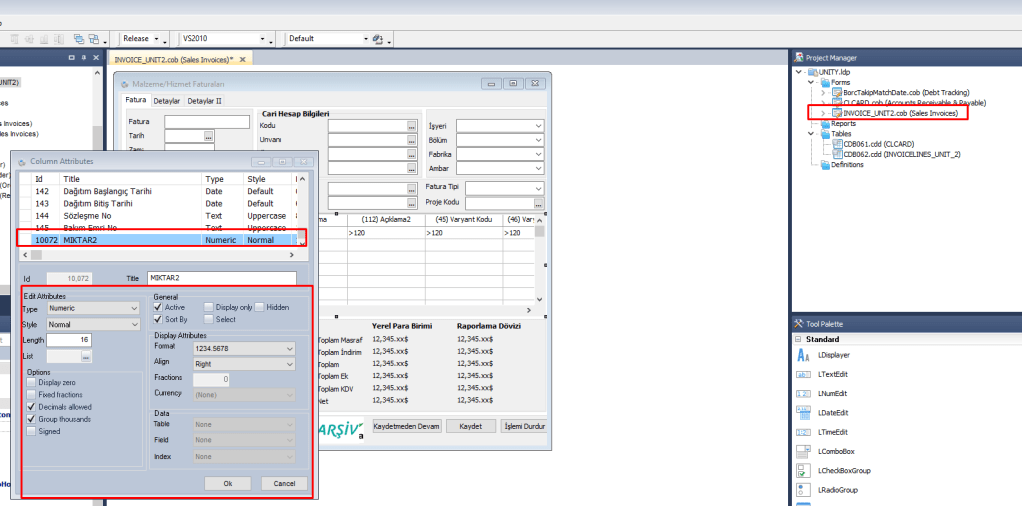 Önce InvoiceGrid grid componentine tıklayıp colattribs içinden MalzemeOzelKodu eklendi: